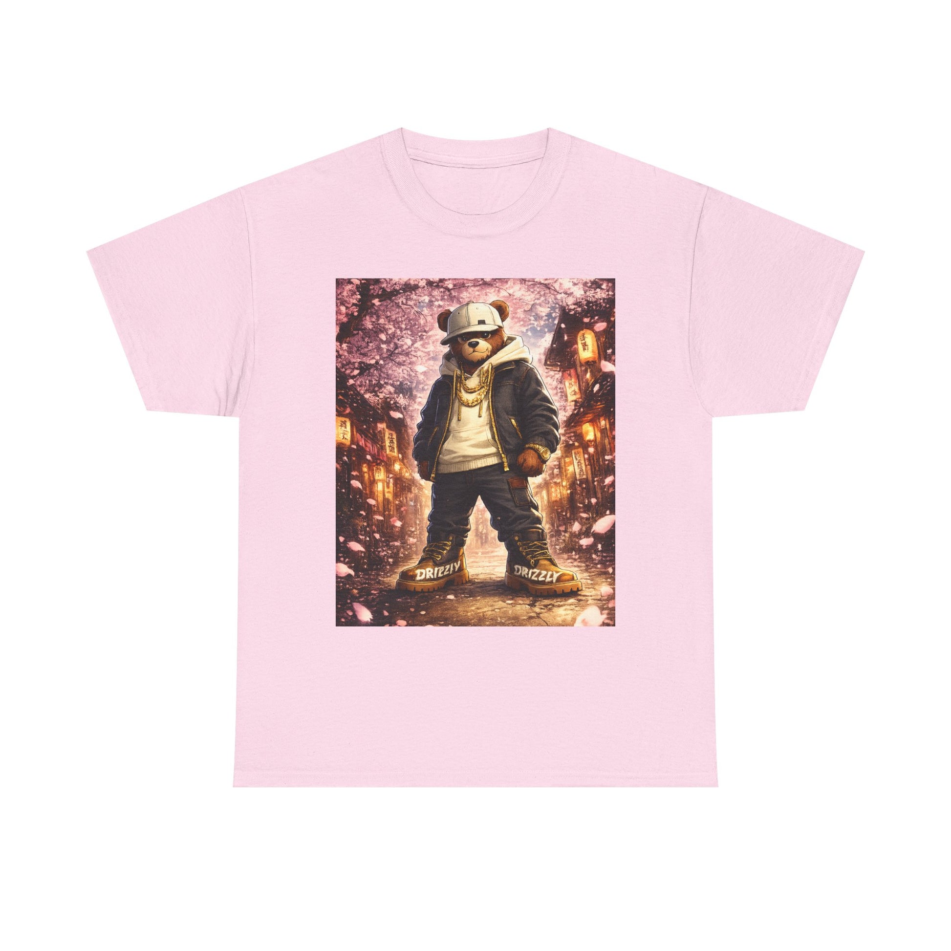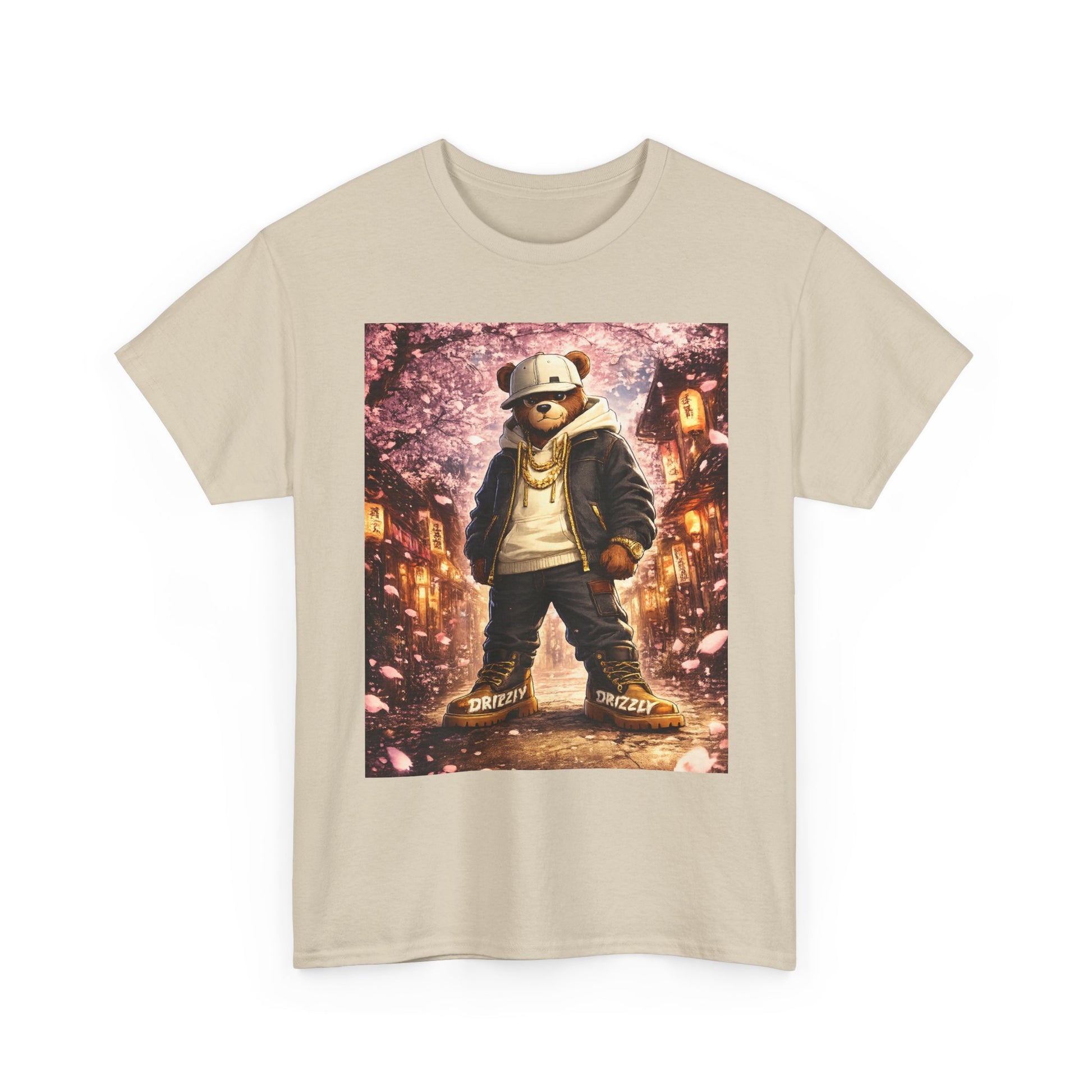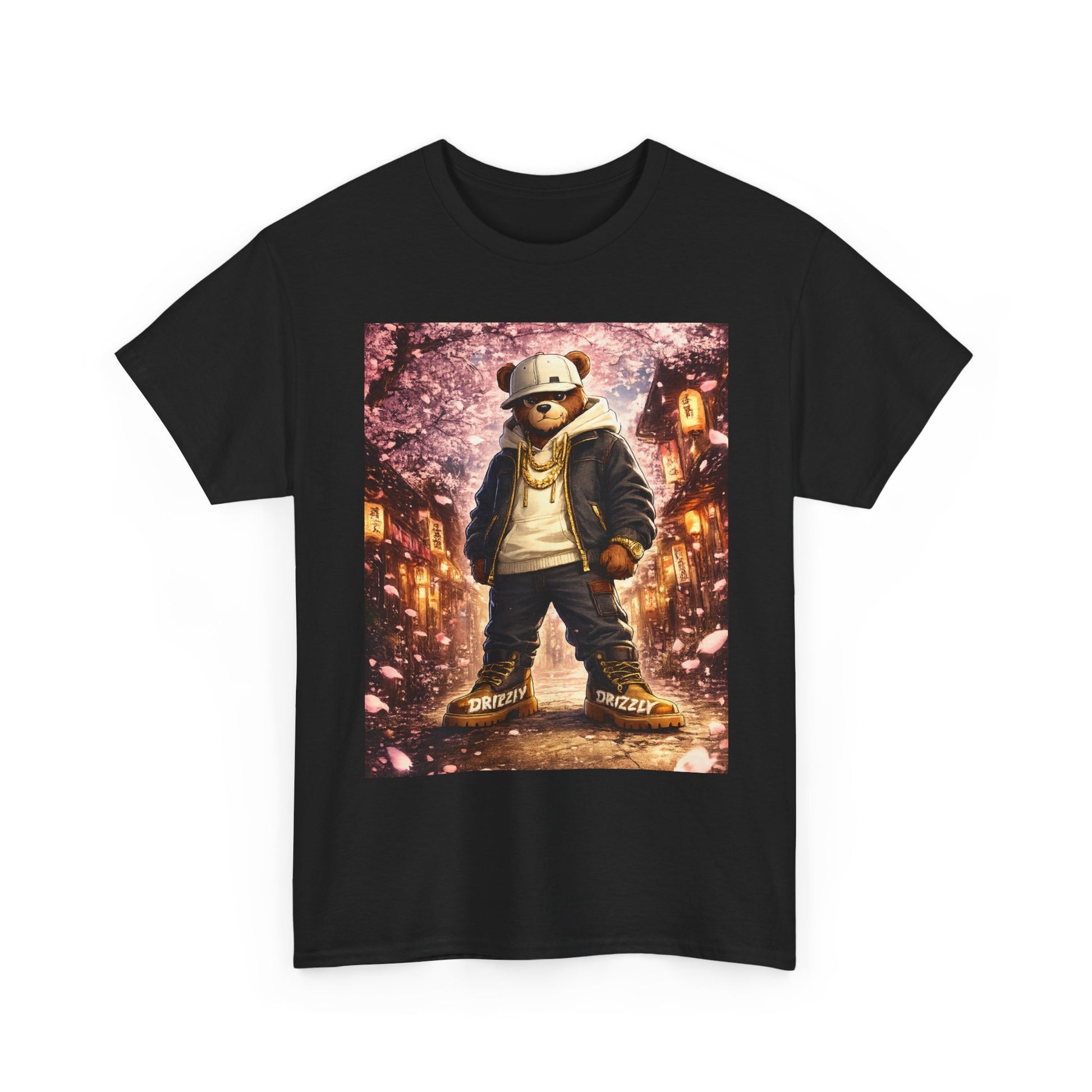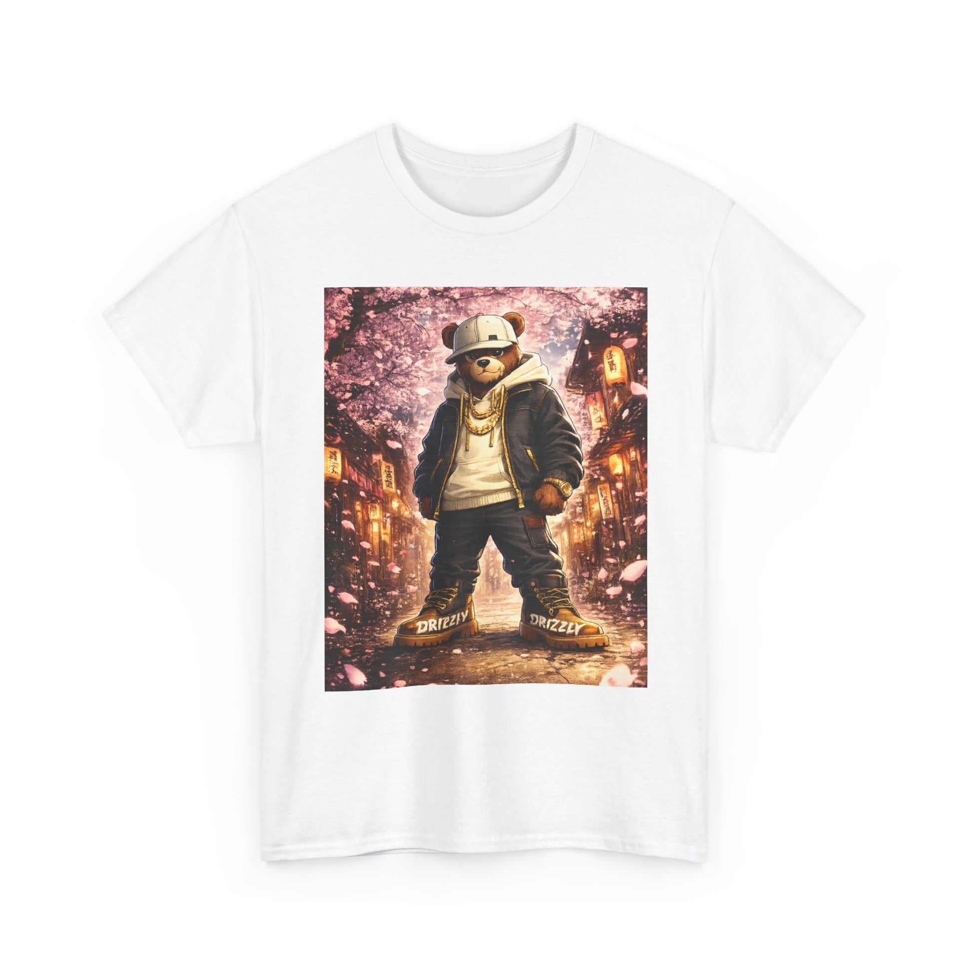 This tee carries a gritty, cinematic energy — a bear-in-a-hoodie standing under falling petals and warm streetlights, like a moment plucked from an urban fairytale. The print’s rich, painterly colors pop against the clean white canvas of the shirt, turning a simple outfit into a statement that’s equal parts streetwise and nostalgic. Wear it on walks through the city at dusk, to casual meetups, or when you want your wardrobe to tell a small, moody story. The classic crew silhouette keeps the focus on the artwork while offering an easy, lived-in feel that layers well under jackets or stands out on its own.