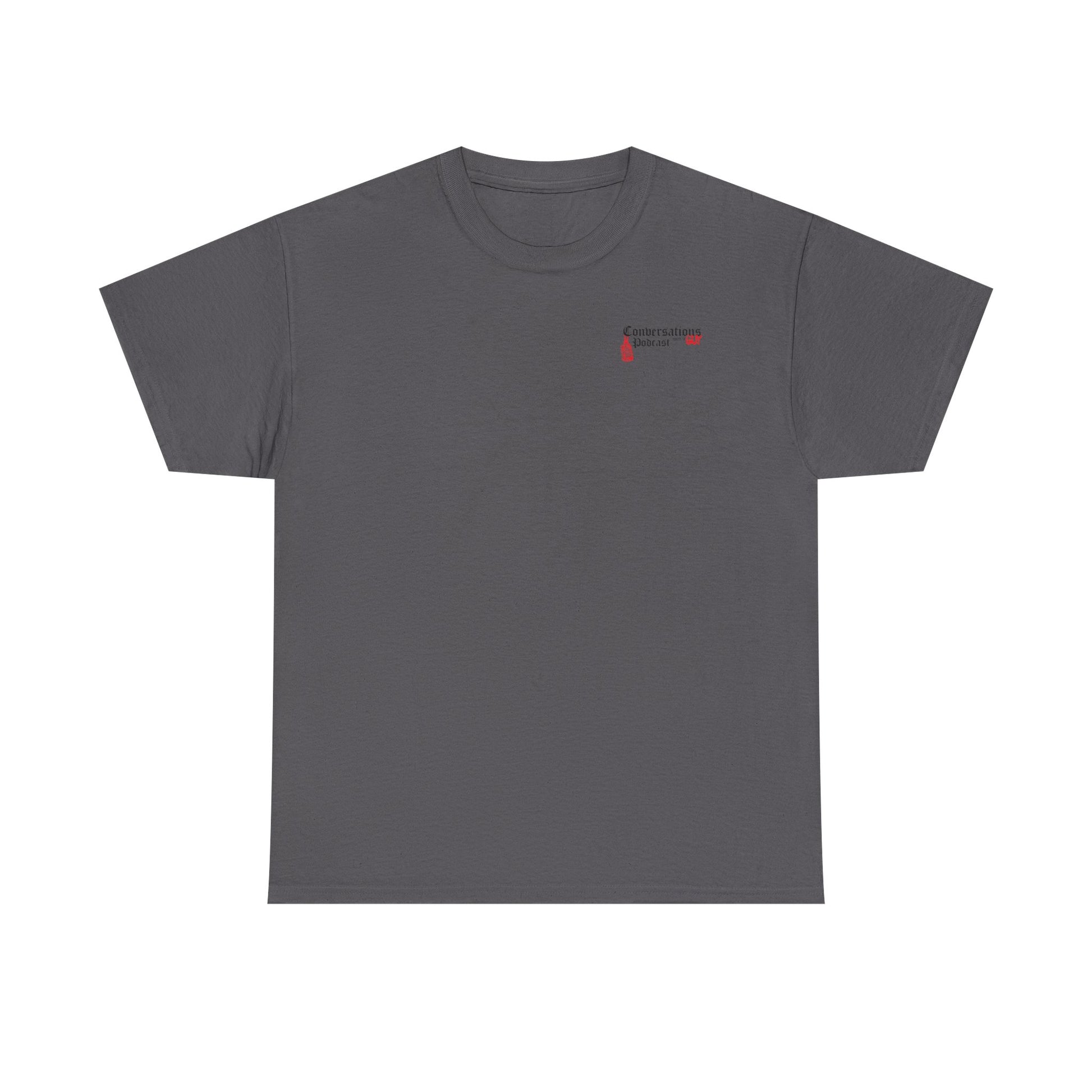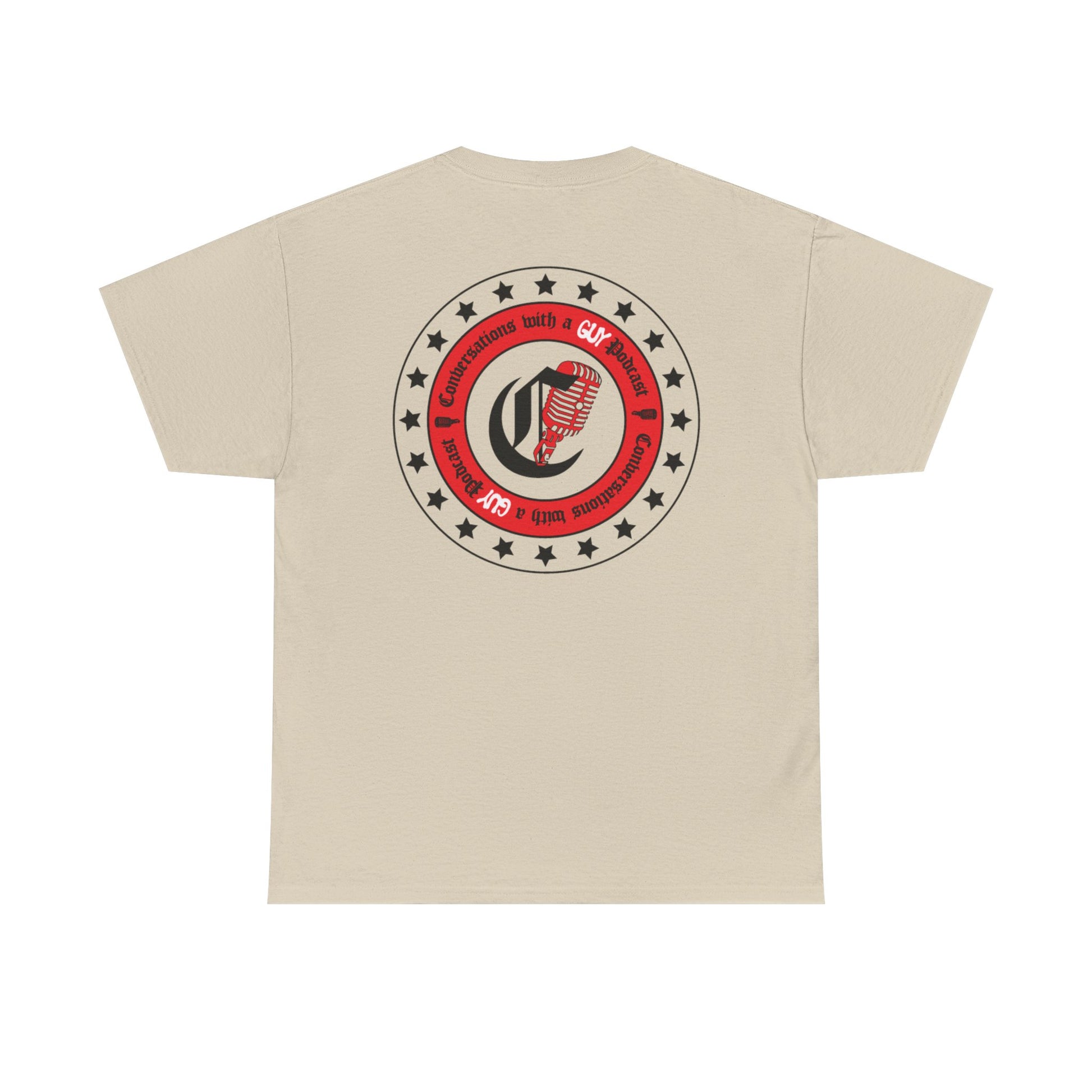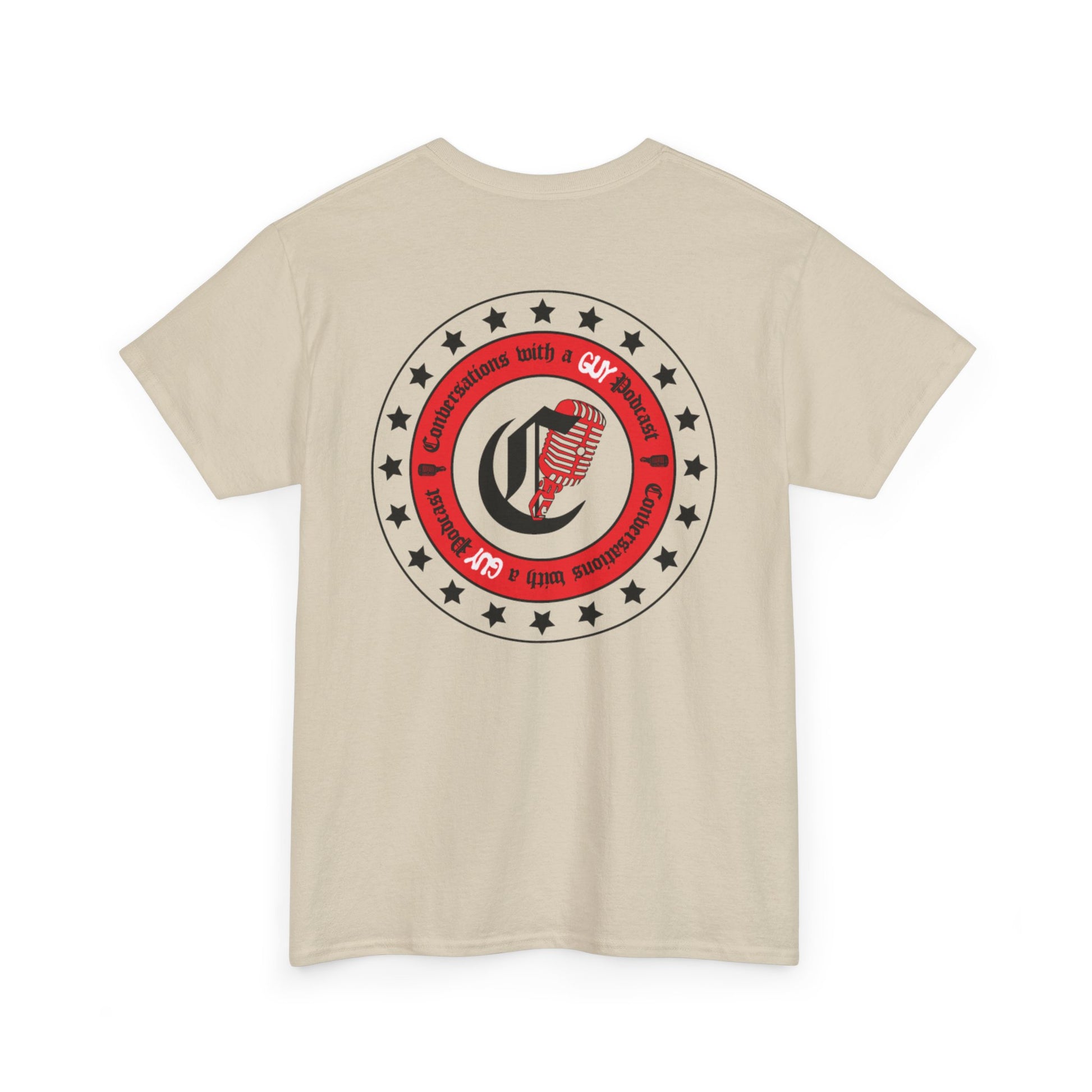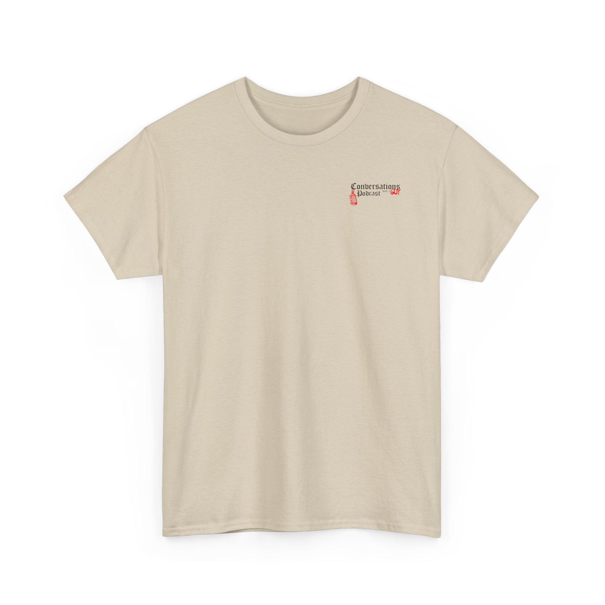 This soft, medium-weight tee feels like an easy morning: breathable, sturdy, and ready to carry a message. The front wears a small, understated emblem over the heart while the back displays a bold circular crest in red, black and white — a look that reads vintage-club energy without feeling forced. It sits comfortably on the shoulders and keeps its shape thanks to taped seams and a ribbed collar. Wear it to rehearsals, meetups, or late-night drives when you want something reliable that still says who you are.