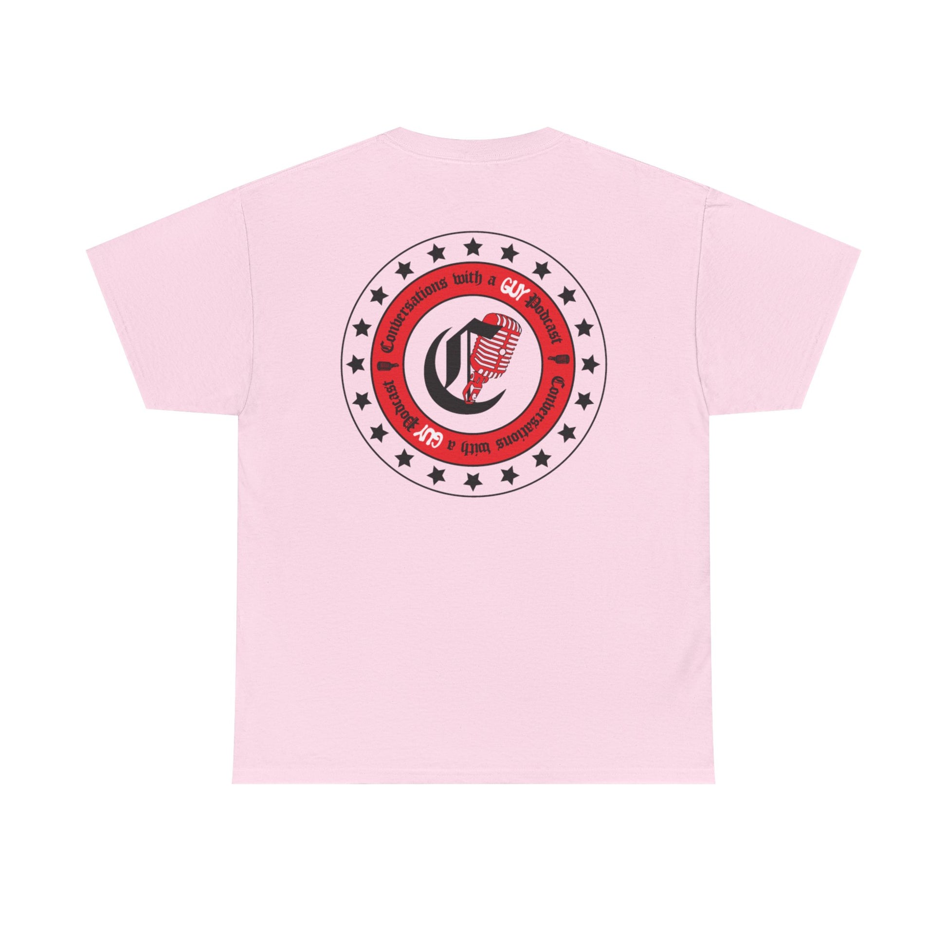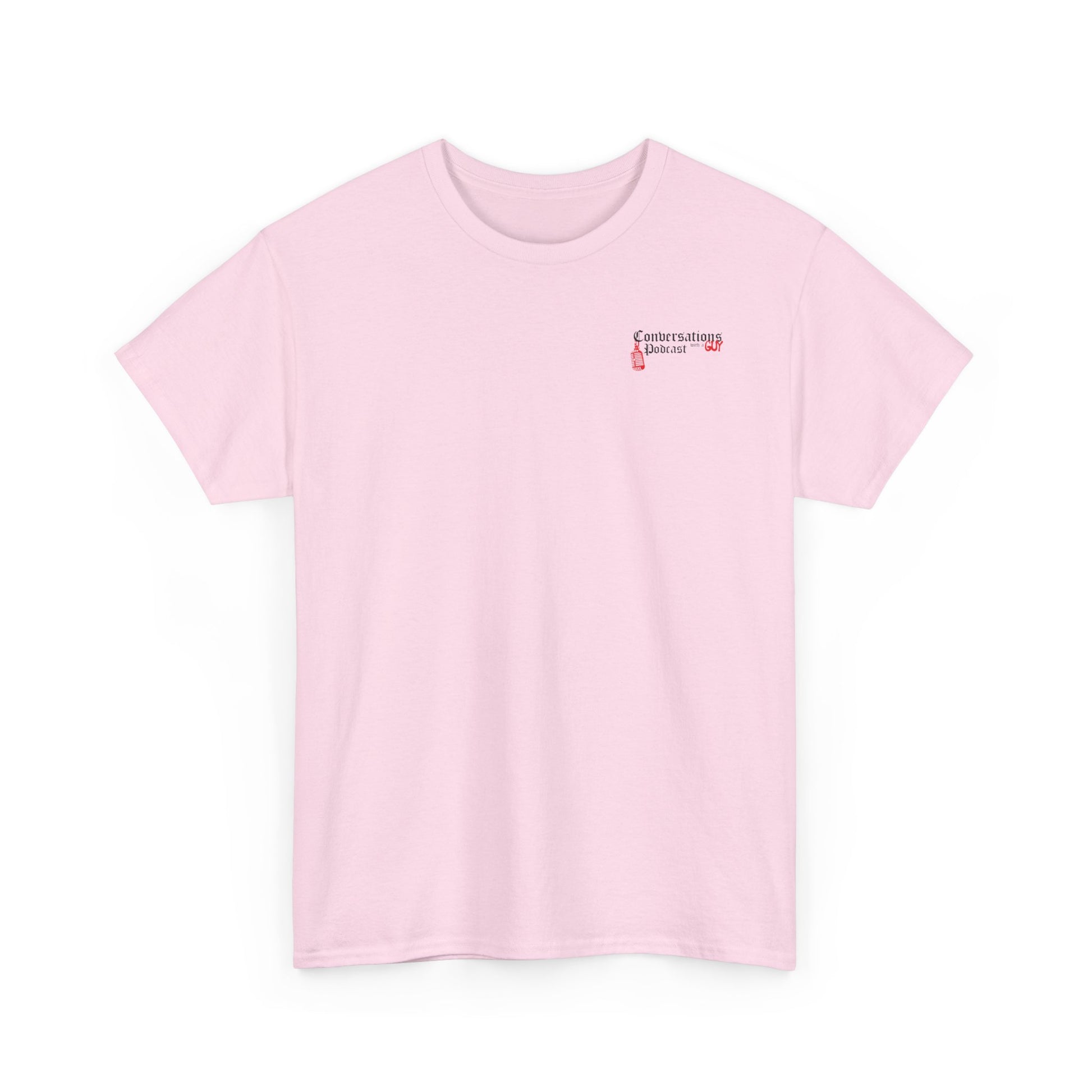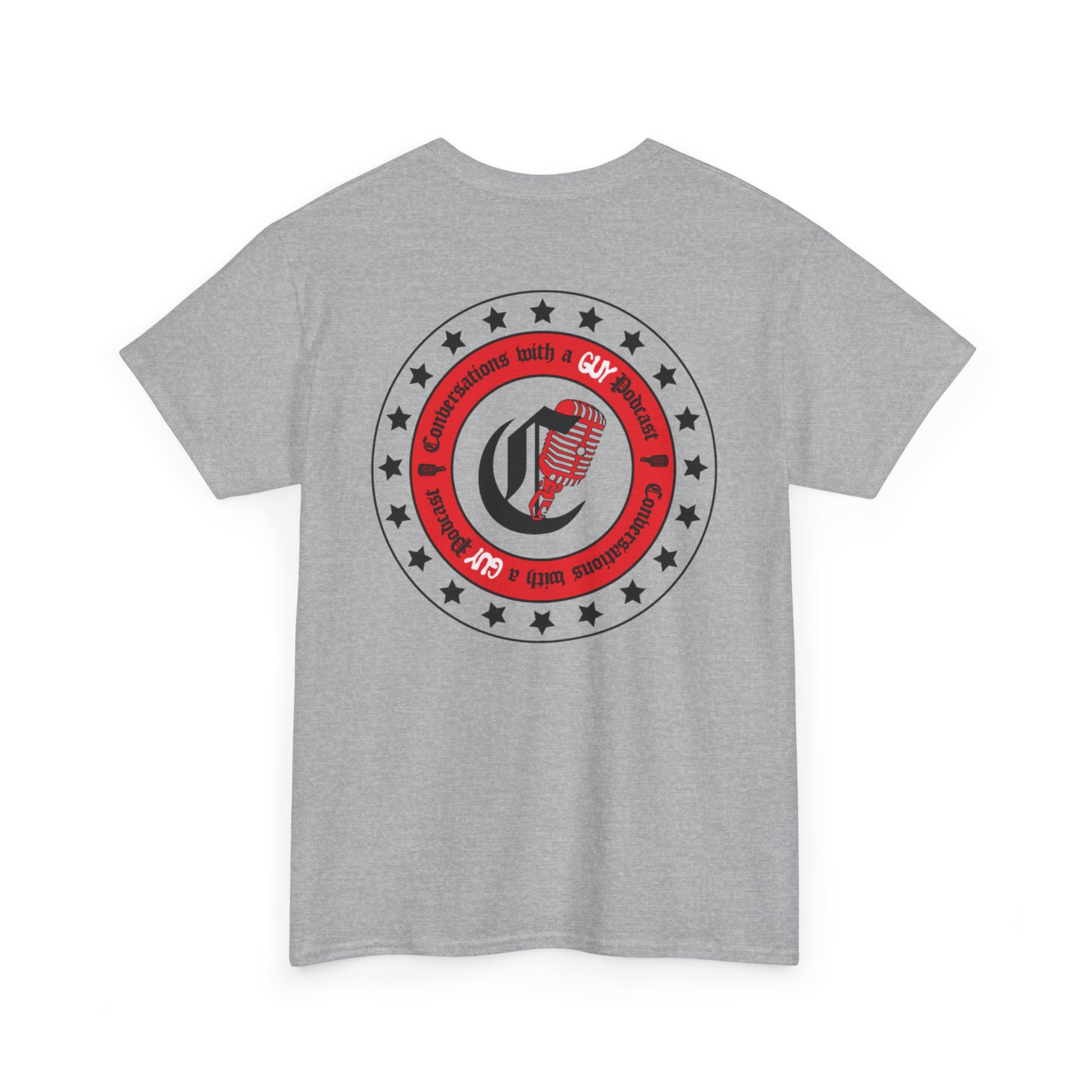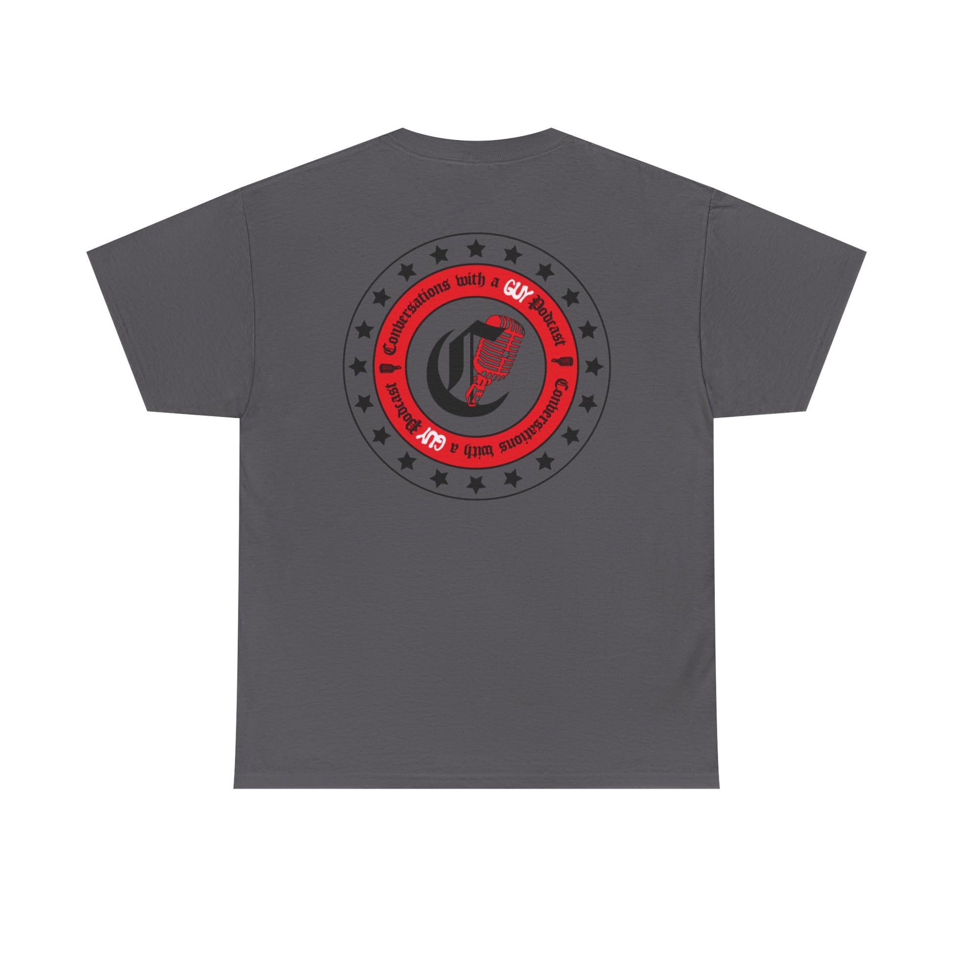 This soft, medium-weight tee feels like an easy morning: breathable, sturdy, and ready to carry a message. The front wears a small, understated emblem over the heart while the back displays a bold circular crest in red, black and white — a look that reads vintage-club energy without feeling forced. It sits comfortably on the shoulders and keeps its shape thanks to taped seams and a ribbed collar. Wear it to rehearsals, meetups, or late-night drives when you want something reliable that still says who you are.